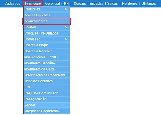 Para acessar o cadastro de Adiantamentos, use o Menu “ Financeiro – Adiantamentos”. Será apresentada a tela principal de Adiantamentos.