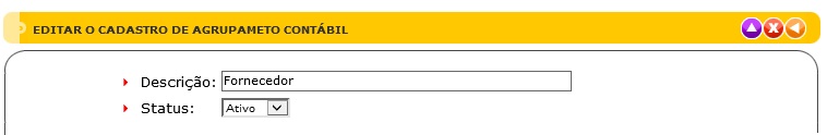 A tela do Cadastro de Agrupamento Contábil possui cinco elementos principais que executam funções distintas, conforme seguem: