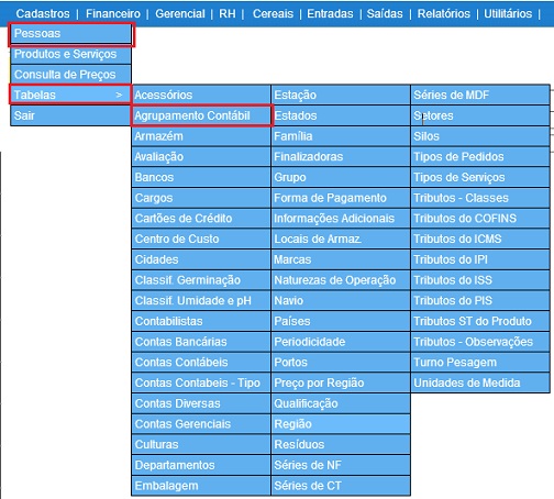 Para acessar o Cadastro de Agrupamento Contábil, use o Menu “Cadastro - Tabelas - Agrupamento Contábil”. Será apresentada a tela principal do Cadastro de Agrupamento Contábil.