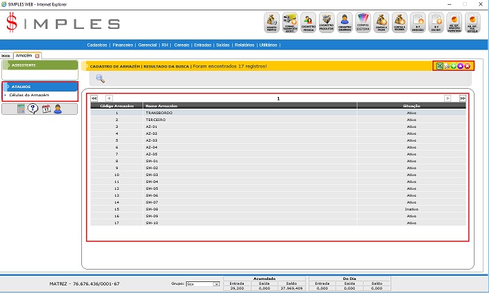 - Grade de Acessórios: Mostra todos os Armazéns cadastrados.