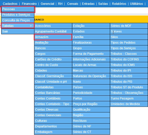 Para acessar o Cadastro de Armazém, use o Menu “Cadastro - Tabelas - Armazém”. Será apresentada a tela principal do Cadastro de Armazém.