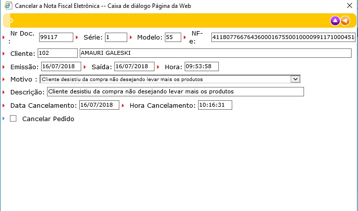 O sistema trabalha com dois tipo de cancelamento de nota fiscal: a inutilização de numeração e o cancelamento. Ambas são acessadas selecionando a nota fiscal na tela de emissão de nota fsical e selecionando a opção "Cancelar a Nota Fiscal".