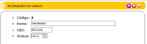 - Para Editar um cargo, o usuário deve selecionar um cargo da grade, e clicar no ícone de editar no navegador. Ao editar os dados desejados do Cargo, clicar no botão de alterar para confirmar a alteração.