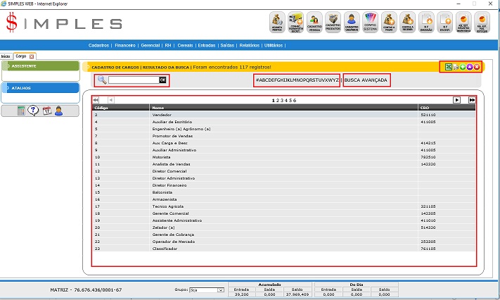 - Grade de Cargos: Mostra todos os Cargos conforme os filtros descritos anteriormente.