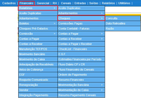 Para acessar este relatório é preciso ir ao Menu “ Financeiro - Relatórios - Cheques”.
