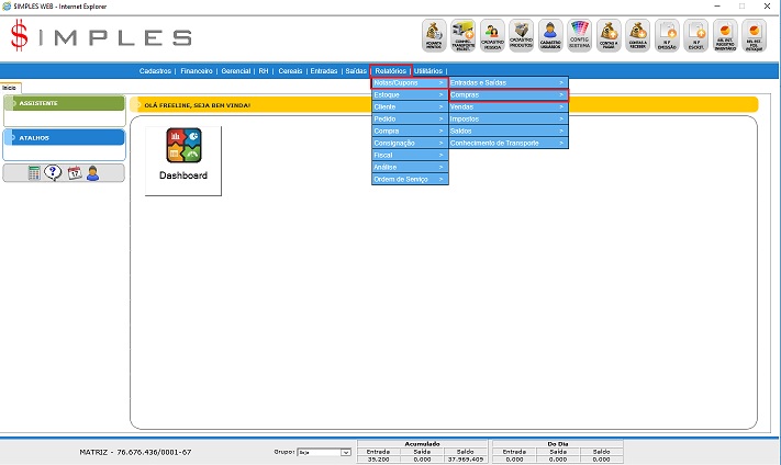Para acessar este relatório é preciso ir ao Menu “ Relatórios - Notas/Cupons - Compras”.