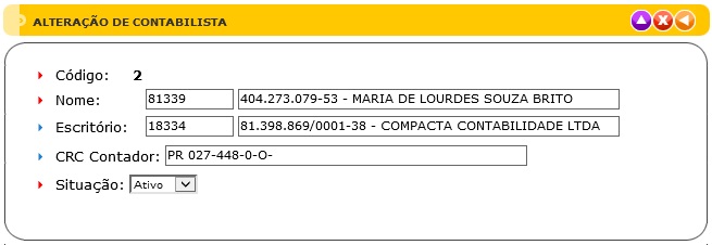 A tela do Cadastro de Contabilistas possui quatro elementos principais que executam funções distintas, conforme seguem: