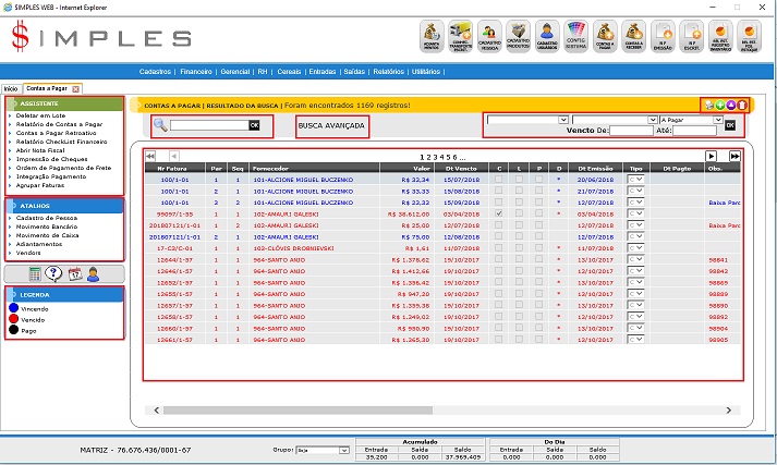 1. Grade de Contas a Pagar: Mostra todas as Faturas conforme os filtros descritos anteriormente nos índices 4 e 5.