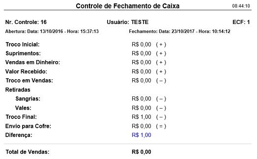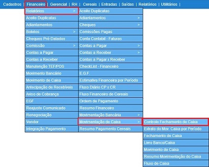 Para acessar este relatório é preciso ir ao Menu “ Financeiro - Relatórios - Movimentação de Caixa - Controle Fechamento de Caixa”.