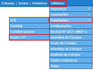 Para acessar a Tela de Importação de Dívidas Bancárias é preciso ir ao Menu “Utilitários – Exportação - Dados TXT”.