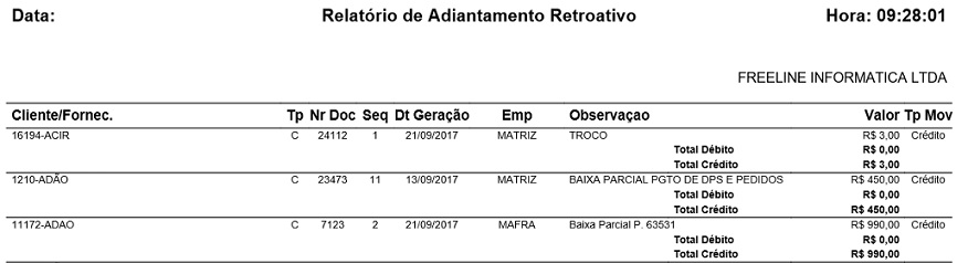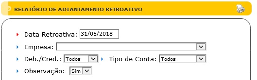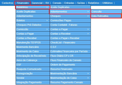 Para acessar este relatório é preciso ir ao Menu “ Financeiro - Relatórios - Adiantamentos - Data Retroativa”.