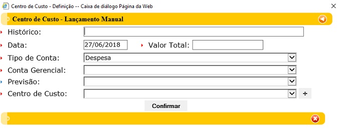 A tela de Definição de Centro de Custo possui sete elementos principais que executam funções distintas, conforme seguem: