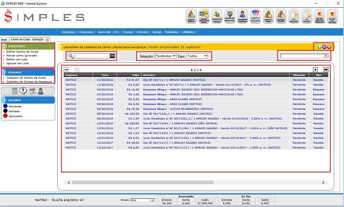4. Situação: Pendentes, Ignorados, Fechados e Todos; Tipo: Todos, Despesas e Receitas;