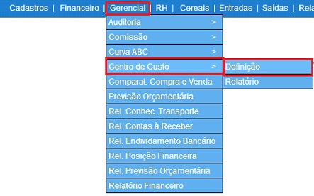 Para acessar, use o Menu “Gerencial - Centro de Custo - Definição ”.