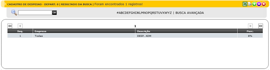 - Filtro Descrição: Permite filtrar a Grade de Despesas do Departamento pela inicial da descrição, de acordo com a letra selecionada no filtro.