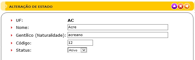 2. Para Editar um Estado, o usuário deve dar um duplo clique na grade ou clicar no ícone de editar no navegador. Ao editar os dados desejados do Estado selecionada, clicar no botão de alterar para confirmar a alteração.