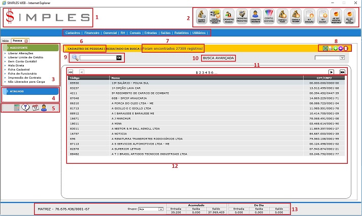 12) Grade de Registros: apresenta os registros da pesquisa com as informações mais relevantes. Pode apresentar barras de rolagem vertical e horizontal caso os dados não caibam dentro da área disponível.