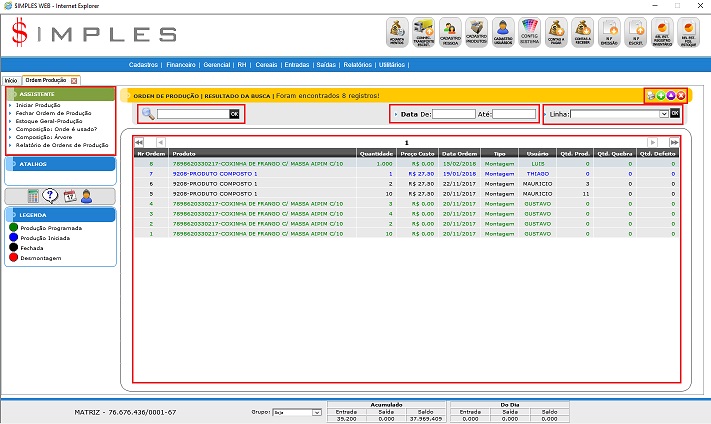 - Grade de Ordens: Mostra todos os documentos de Ordem de Produção conforme os filtros descritos anteriormente.