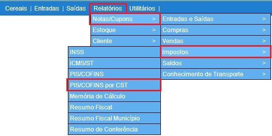 Para acessar este relatório é preciso ir ao Menu “Relatórios-Notas/Cupons - Impostos - PIS/COFINS por CST”.