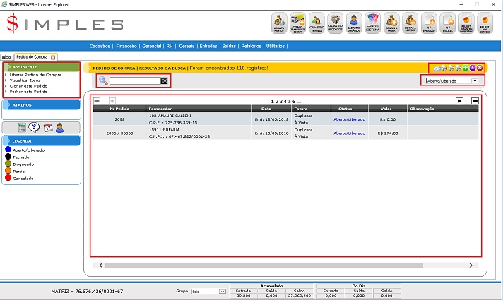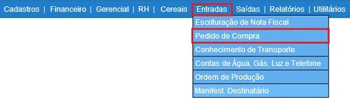 Para acessar os Pedidos de Compra, use o Menu “ Entradas - Pedidos de Compra”. Será apresentada a tela principal de Pedidos de Compra.
