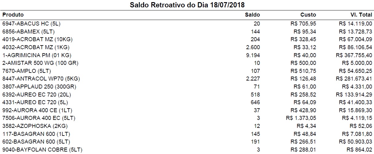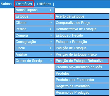 Para acessar este relatório é preciso ir ao Menu “ Relatórios-Estoque-Posicao de Estoque Retroativo”.