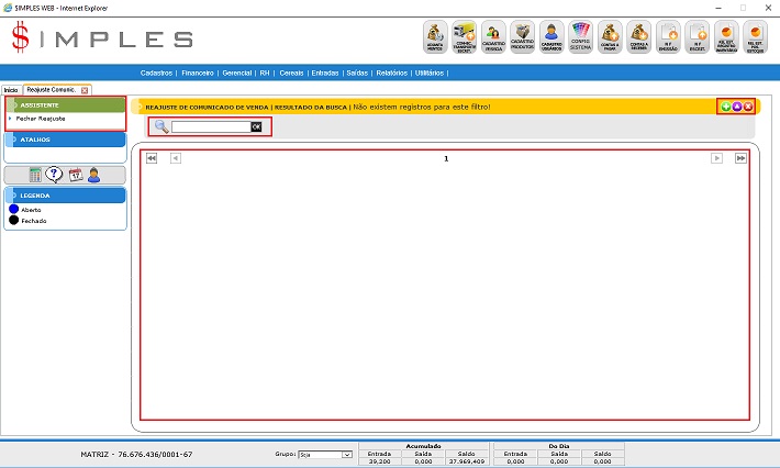 - Grade de Reajuste: Mostra todos os cadastros de Reajustes;