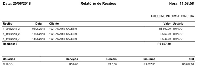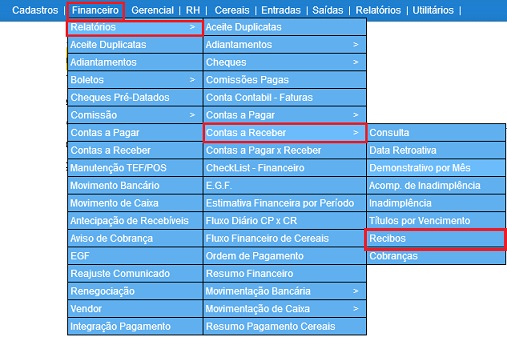 Para acessar este relatório é preciso ir ao Menu “ Financeiro - Relatórios - Contas a Receber - Recibos”.