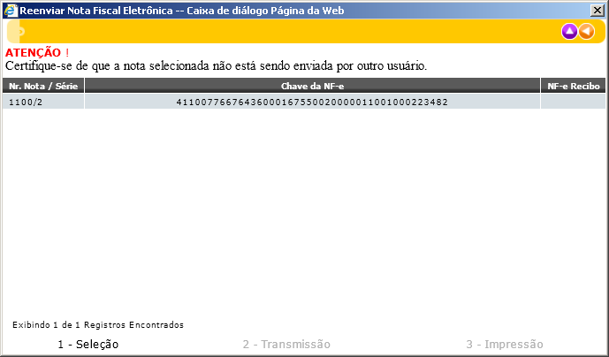 Selecione a NF-e que deseja fazer o reenvio e confirme. O sistema iniciará o processo de reenvio da NF-e. Caso o problema seja resolvido a NF-e poderá ser impessa ou feito novamente o envio normal conforme o caso.