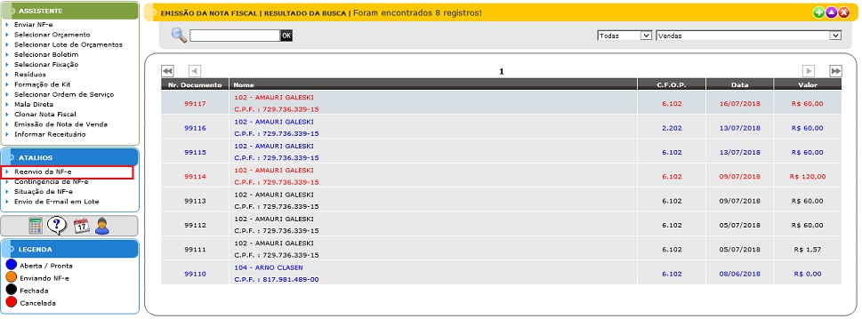 Para fazer o Reenvio de Notas Fiscais, clique em "Reenvio da NF-e" no menu Assistente da tela de Emissão de Nota Fiscal.