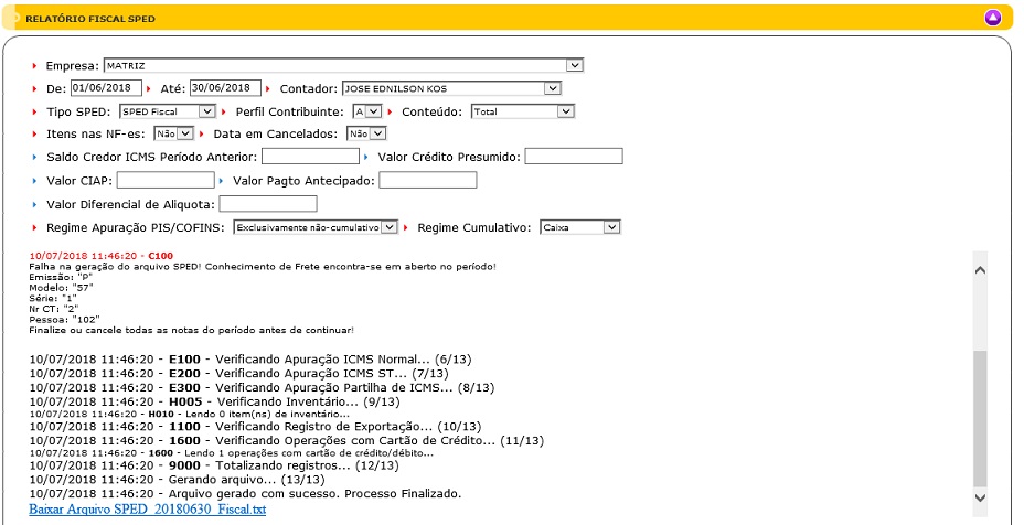 Terá possibilidade de ser gerado o arquivo de texto do SPED clicando no ícone “Gerar Arquivo” do navegador.