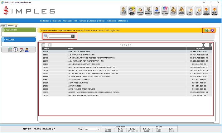 - Pesquisa: Permite fazer uma pesquisa genérica pela razão social ou pelo código da pessoa.
