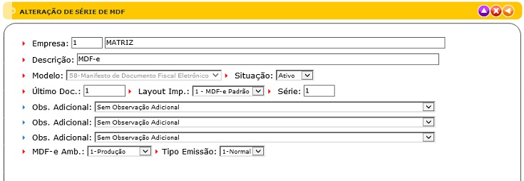 - Para Editar uma Série de MDF, o usuário deve selecionar um registro da grade, e clicar no ícone de editar no navegador. Ao editar os dados desejados do registro escolhido, clicar no botão de alterar para confirmar a alteração.