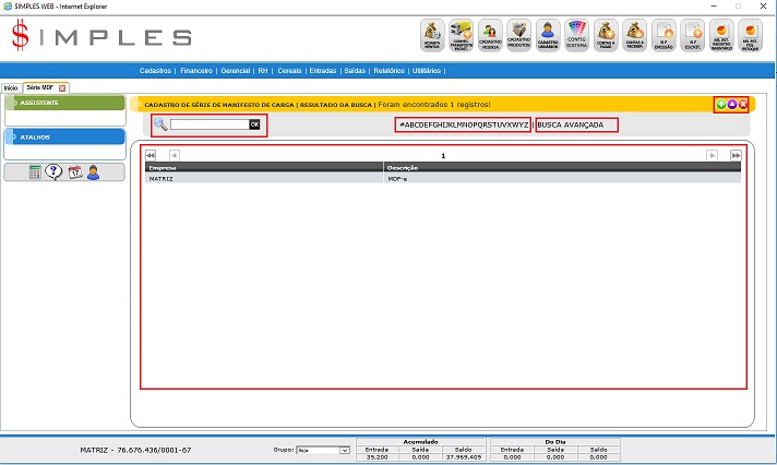 - Busca Avançada: Permite fazer uma busca avançada de Séries de MDFcom base em todos os campos da tabela.