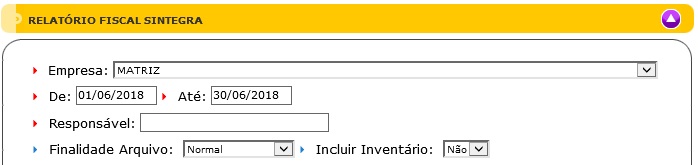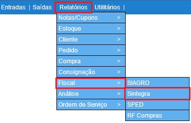 Para acessar este relatório é preciso ir ao Menu “ Relatórios - Fiscal - Sintegra”.
