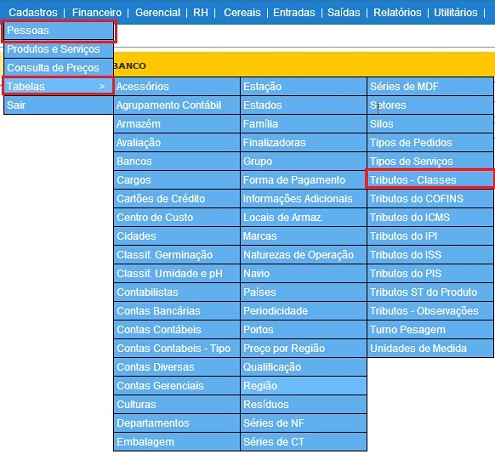 Para acessar o cadastro de Tributos - Classes, use o Menu “Cadastro - Tabelas – Tributos - Classes”. Será apresentada a tela principal de Tributos - Classes.
