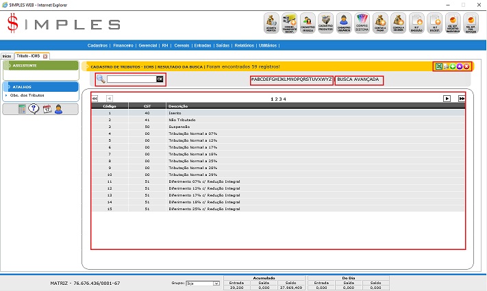4. Busca Avançada: Permite fazer uma busca avançada de Tributos do ICMS com base em todos os campos da tabela.