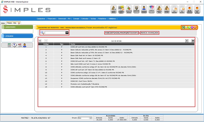 - Navegador: Nesta área se encontram as opções de Incluir, Editar, Deletar, Visualizar Relatório ou Gerar Arquivo Excel, e Sair da Tela.