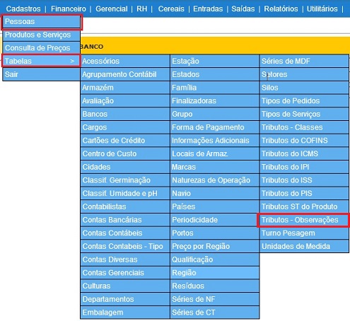 Para acessar o cadastro de Tributos - Observações, use o Menu “Cadastro - Tabelas – Tributos - Observações”. Será apresentada a tela principal de Tributos - Observações.