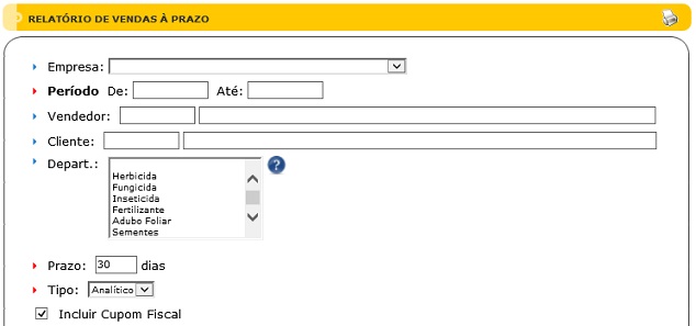Para acessar este relatório é preciso ir ao Menu “ Relatórios - Notas/Cupons - Vendas - Vendas à Prazo”.