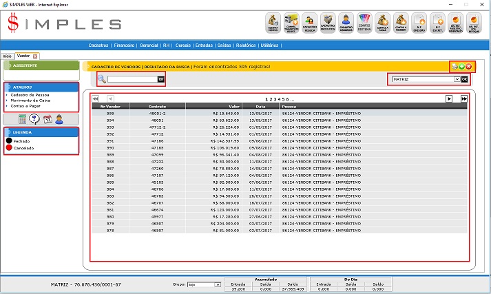 5- Grade de Vendors: Mostra todos os Vendors conforme os filtros descritos anteriormente.