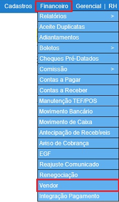 Para acessar o cadastro de Vendors, use o Menu “Financeiro - Vendor”. Será apresentada a tela principal de Cadastro de Vendors.